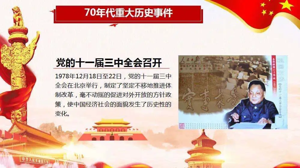 1978年党的十一届三中全会召开,以邓小平同志为核心的党的第二代中央领导集体,制定了坚定不移地推进体制改革,毫不动摇的促进对外开放的方针政策,为中国人民“富起来”奠定基础。这一时期,中美建交、建立经济特区、创建希望工程、举办第十届亚运会、香港回归、98年抗洪救灾、澳门回归、加入世界贸易组织、抗击非典、首次载人航天、汶川抗震救灾、举办奥运会等一系列重大事件,无不彰显中国国力的突飞猛进和经济的迅速增长,充分认证了“改革开放”是当代中国命运的关键抉择,是发展中国特色社会主义和中华民族伟大复兴的必经之路,只有改革开放,才能发展中国。
