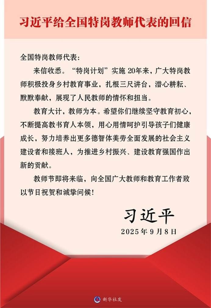 新华社北京9月9日电 在第四十一个教师节来临之际,中共中央总书记、国家主席、中央军委主席习近平给全国特岗教师代表回信,提出殷切希望,并向全国广大教师和教育工作者致以节日祝贺和诚挚问候。