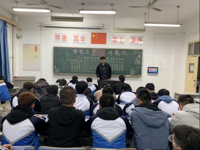 为深入贯彻落实习近平总书记关于宪法学习宣传教育的系列重要指示精神,进一步在大学生中普及宪法知识、弘扬宪法精神、树立宪法权威,11月23日晚自习期间,汽车学院组织各年级学生开展“学宪法 讲宪法”主题班会。