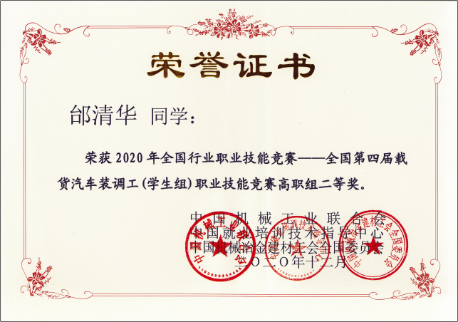 2020年12月3日,由中国机械工业联合会、中国就业培训技术指导中心、中国机械冶金建材工会全国委员会共同主办,机械工业职业技能鉴定指导中心、陕西天益教育科技有限公司、陕西交通职业技术学院、陕西汽车集团职工培训大学共同承办的“2020年全国行业职业技能竞赛--全国第四届载货汽车装调工(学生组)职业技能竞赛”,全国决赛经过两天紧张激烈的角逐,顺利完成了各项赛程,今天圆满收官。来自全国各地的选手同台竞技、各展风采,既交流了技术、切磋了技艺,同时也展示了各参赛队良好的精神风貌。我院由汽车工程学院刘波、郭炎伟两位老师指导的邰清华、刘园鹏二位选手代表参赛。经过紧张激烈的角逐,最终邰清华荣获高职组个人赛二等奖,刘园鹏荣获三等奖,汽车工程学院教师郭炎伟获“优秀指导老师”奖。