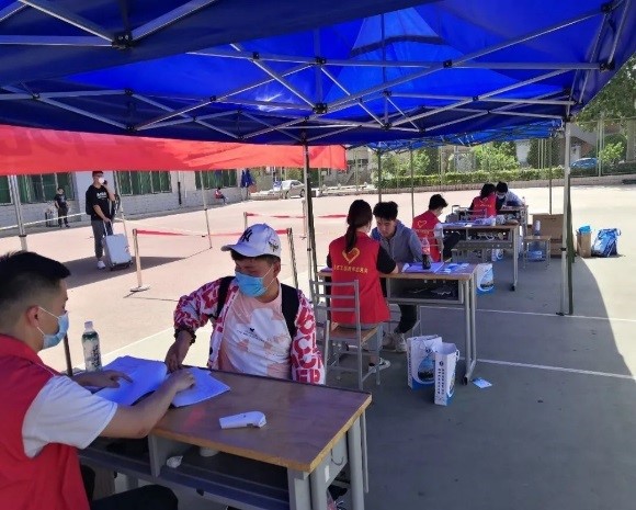 上午七点,各位老师和志愿者就已经在学生接待点集合,按照预先分配好的任务和岗位,分别进行消毒、引导排队、测量体温、核对信息,发放防疫物资、运送行李等服务活动。