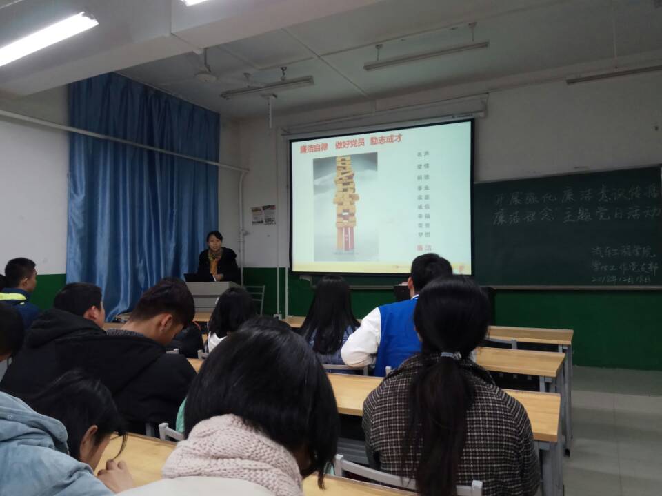 为进一步强化大学生的廉洁意识,汽车工程学院于2018年12月18日下午在崇文北楼402举办了“强化廉洁意识,传播廉洁理念”的党课学习活动。此次党课由学工办主任刘冽主持,党总支书记高亚宁主讲。