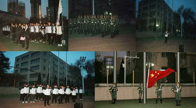 7点整,升旗仪式正式开始。在初冬的寒风中,国旗护卫队精神抖擞,迈着整齐划一的步伐护送鲜艳的五星红旗入场。五星红旗伴随着雄壮的国歌徐徐升起,全体师生面向国旗行注目礼。
