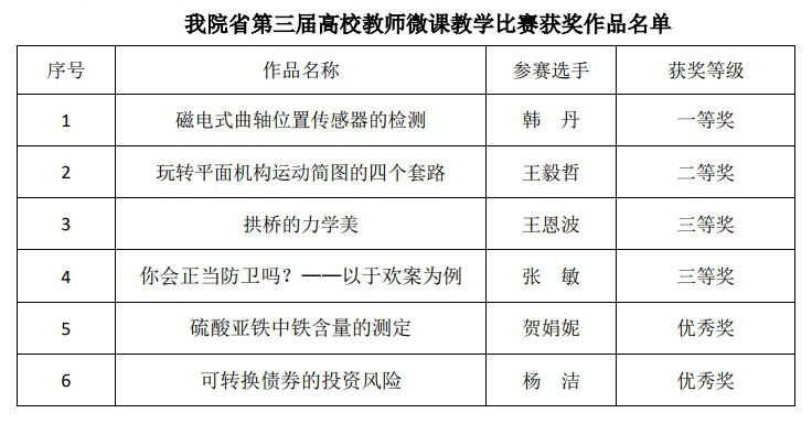 近日,根据省教育厅公布的陕西省第三届高校教师微课教学比赛评选结果(陕教〔2018〕225号),我院推荐的6件作品获奖,其中,韩丹同志的《磁电式曲轴位置传感器的检测》获一等奖,王毅哲同志的《玩转平面机构运动简图的四个套路》获二等奖,王恩波、张敏同志的《拱桥的力学美》、《你会正当防卫吗?——以于欢案为例》等作品获三等奖,贺娟妮、杨洁同志的《硫酸亚铁中铁含量的测定》、《可转换债券的投资风险》等作品获优秀奖,我院获本次比赛优秀组织奖。