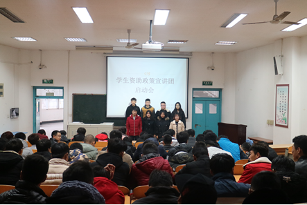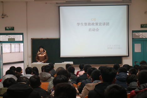 2018年1月16日下午,汽车工程学院在崇文西楼102教室举行学生资助政策宣讲团启动仪式,参加仪式的有汽车学院受助学生100余名,并成立了“学生资助宣传大使”,主要为了加大学生资助宣传力度,扩大宣传效果,利用寒假期间开展学生资助宣传工作。会上,学生资助宣传大使汽营1603李佰毅,宣读学生资助宣传大使倡议书,号召全体“大使”担起责任,做资助政策的学习者;做资助政策的传播者;做知恩感恩的践行者。并结合自己在国家资助政策的帮助下安心学习、健康成长的亲身经历帮助学弟学妹和他们的家长解除后顾之忧。